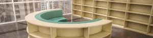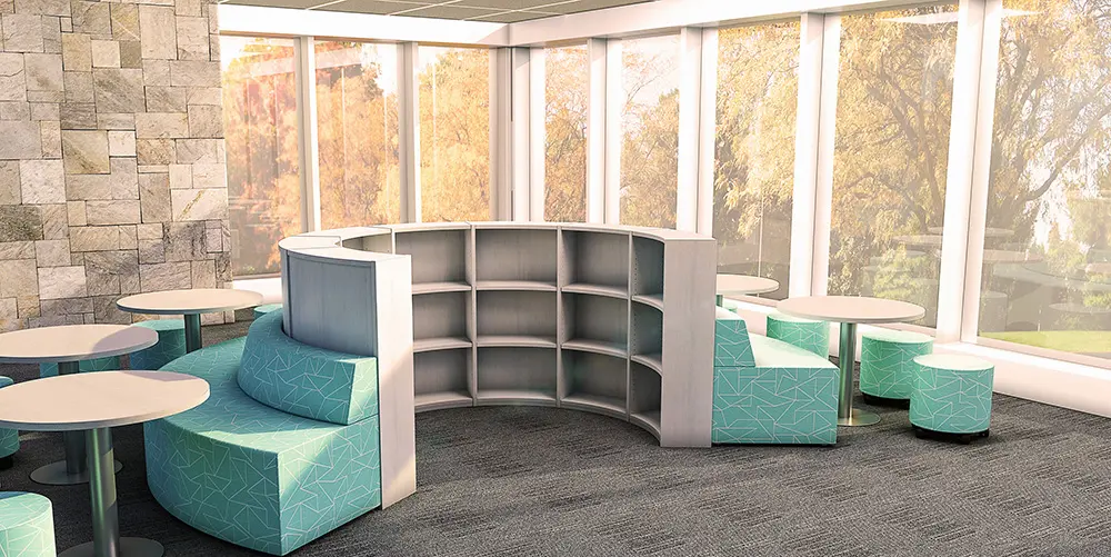 The Blueridge line of shelving offers shapes to fit any kind of flow and design your space requires. Pair it with the soft seating Lenoir lounge furniture. The two were designed to fit angles and lengths as a set.