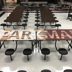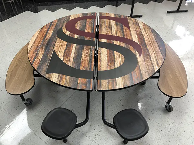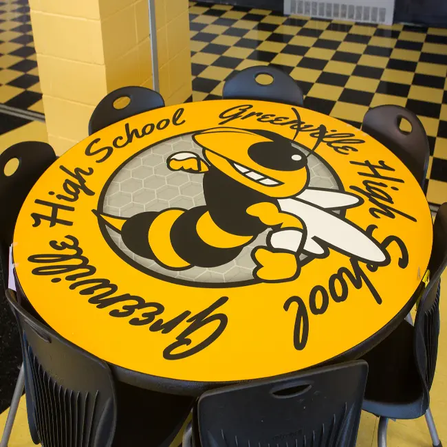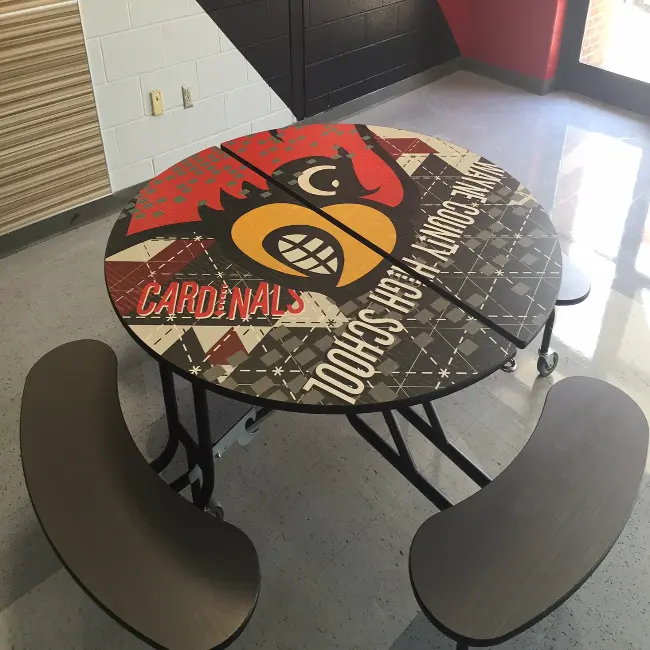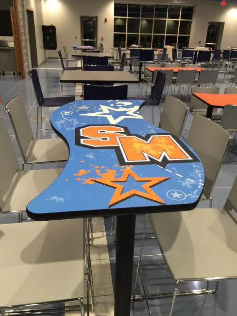 Palmer Hamilton is one of the largest producers of custom logo laminate tables and offers customized graphic design on any of our tables, waste and recycling receptacles and cabinets with no minimum quantity requirements. Colorful designs bring your cafeteria to life, enticing students to stay for lunch.