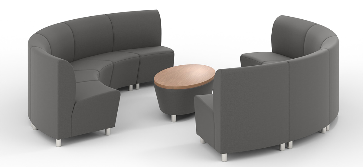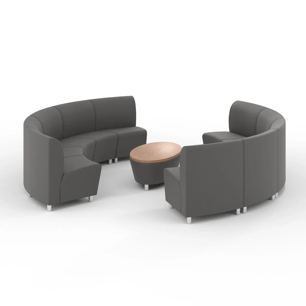The Haywood modular lounge seating collection from Palmer Hamilton was built as a direct answer to that problem. The system starts with a deceptively simple idea: give the room the ability to be different things on different days. Straight chair sections connect with 22.5 degree and 45 degree curved pieces in any sequence. Pie-shaped end caps close off a cluster. Coordinating ottomans and occasional tables in round, square, and oval shapes drop into the configuration wherever the layout calls for them. The result is not a sofa. It is not a cluster of chairs. It is a system that follows the room instead of forcing the room to follow it.